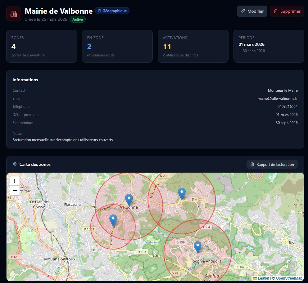 Offrez le premium Five Angels automatiquement à tous les habitants et touristes présents dans vos zones de couverture. Une solution moderne pour valoriser votre politique de sécurité locale.